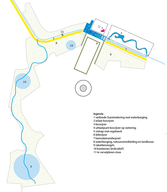 Water speelt een prominente rol op het landgoed. De kwaliteiten van water worden op verschillende manieren benut in het plan. Water versterkt de stilte.