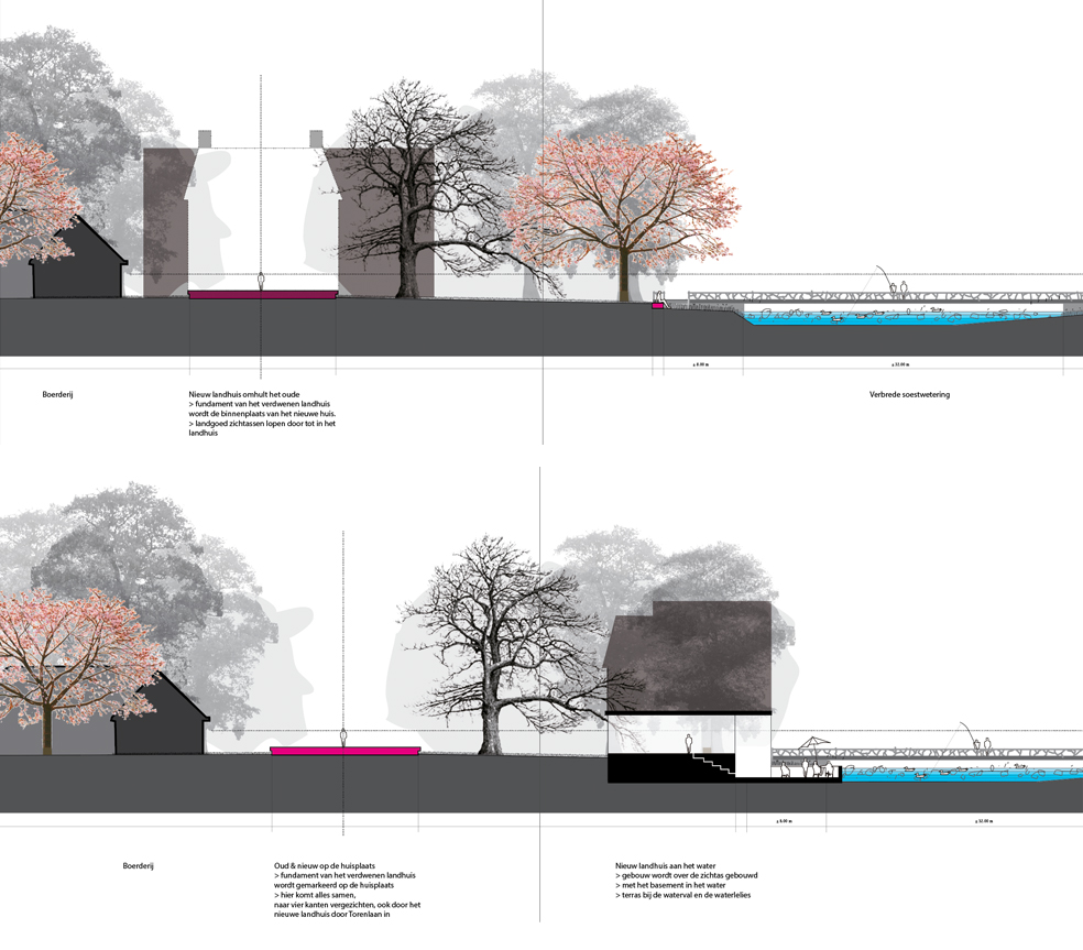 Varianten voor de situering van een nieuw landhuis. Op de oude huisplaats of aan de wetering, bij de nieuwe vistrap.