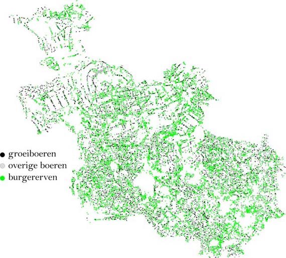 Al de erven waar niet meer geboerd wordt, noemen we – gemakshalve – burgererven. In Overijssel zijn dit er nu zo’n 17.000. Op de kaart is te zien, dat de burgererven overal voorkomen: het overgrote deel van de provincie is een mix van boeren en burgers. Maar er zijn wel regionale en lokale verschillen. In de kop van Overijssel, zoals in de polder Mastenbroek, domineren bijvoorbeeld nog steeds de – donkerbruine – boerenerven, terwijl de randen van de steden, dorpen en natuurgebieden groen kleuren van de burgererven. Hier verdwijnt het agrarische karakter en zijn steeds meer ‘burgerlandschappen’ aan het ontstaan.