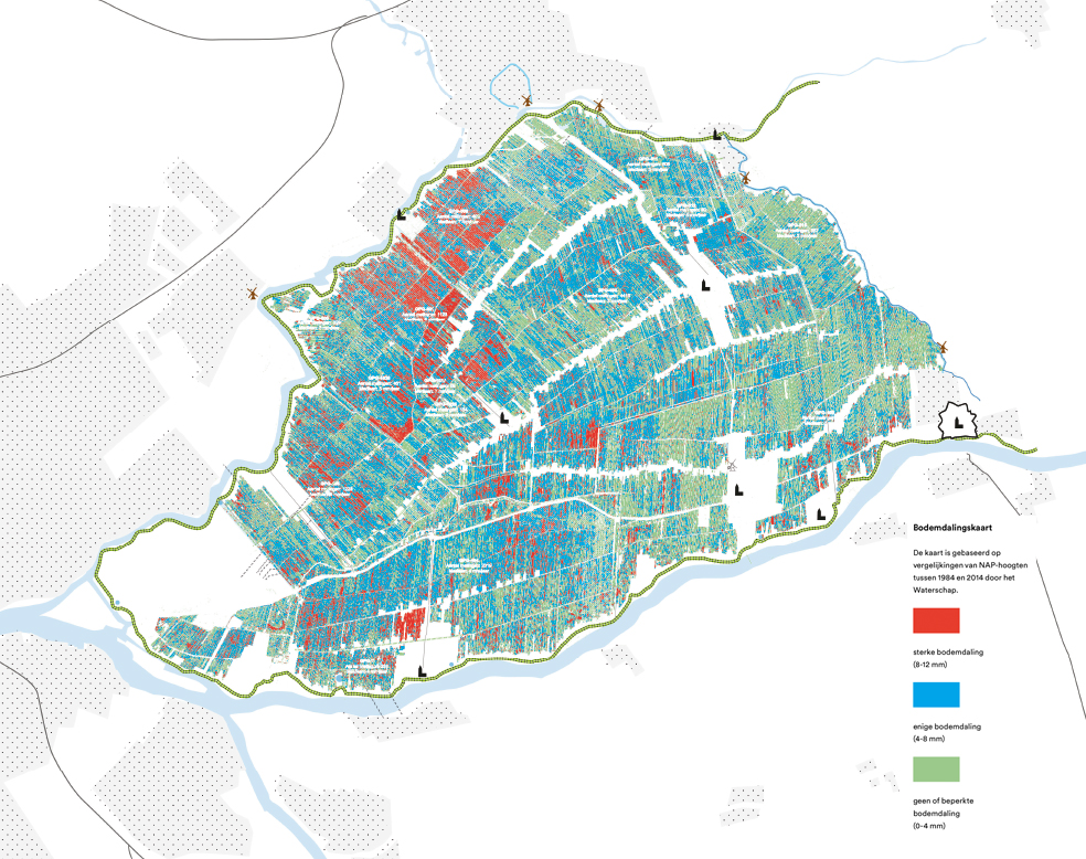 Bodemdaling Krimpernerwaard. Veel lokale verschillen door verschillen in bodemtypen, ontwateringsdiepte en de hydrologische situatie (kwel of infiltratie).