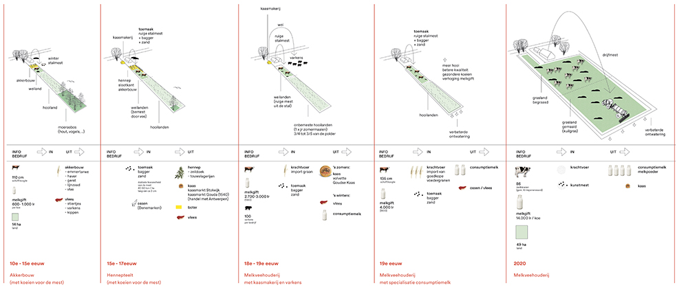 Ontwikkeling boerenbedrijven door de tijd. De boeren hebben steeds hun bedrijfsvoering aangepast aan de steeds natter wordende omstandigheden in de polder en veranderende wensen uit de maatschappij.