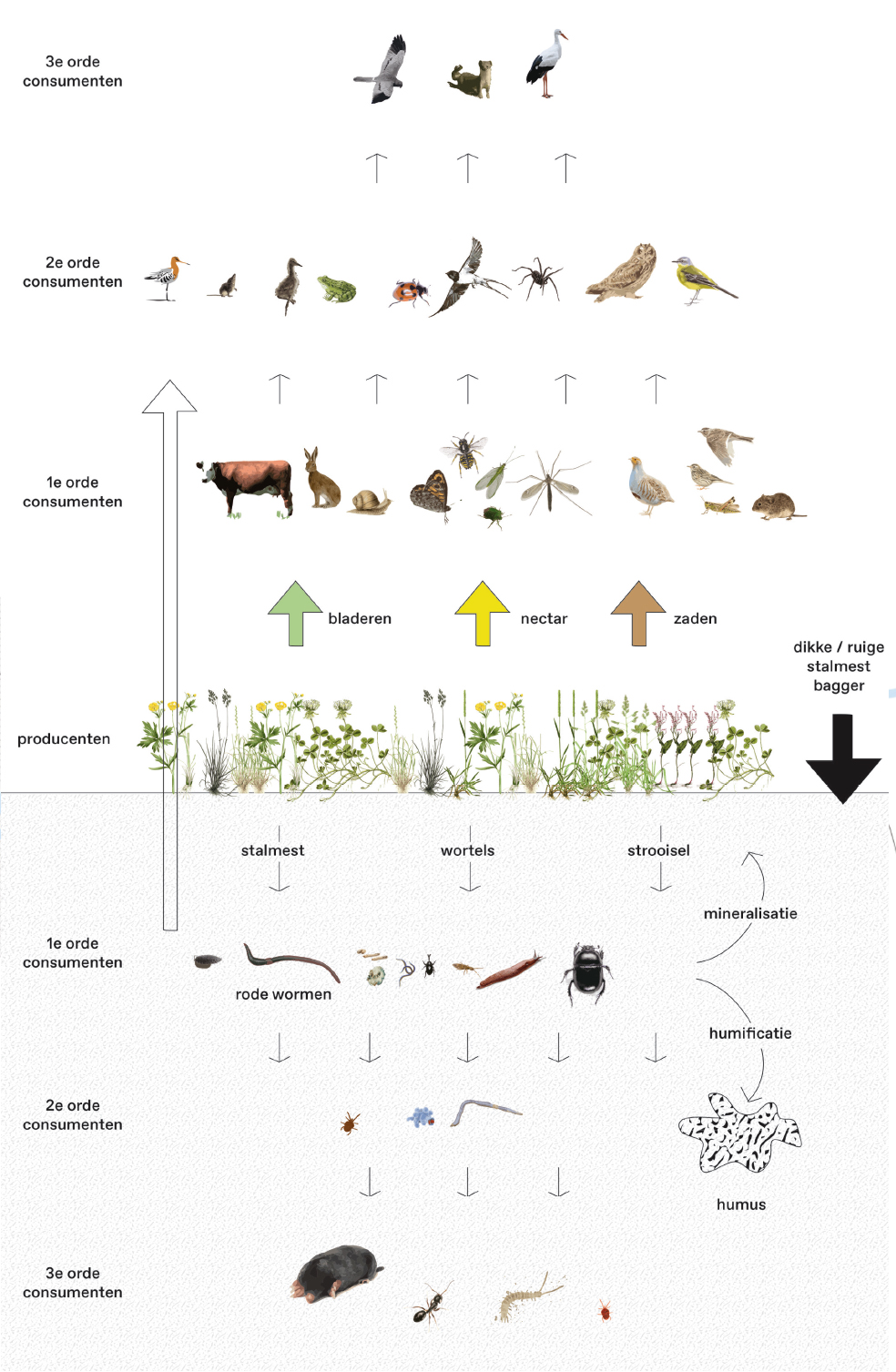 Voedselweb. Schematische weergave van het voedselweb op een kringloopbedrijf. (Gebaseerd op: ‘Earth, worms & birds, J. Onrust, 2017)